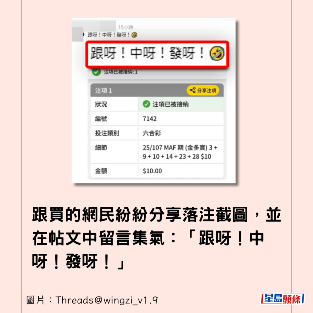 跟買的網民紛紛分享落注截圖,並在帖文中留言集氣:「跟呀!中呀!發呀!」「跟隊去成就壯舉。」「跟咗,約咗agent睇樓。」「師兄有錢齊齊賺啦。」