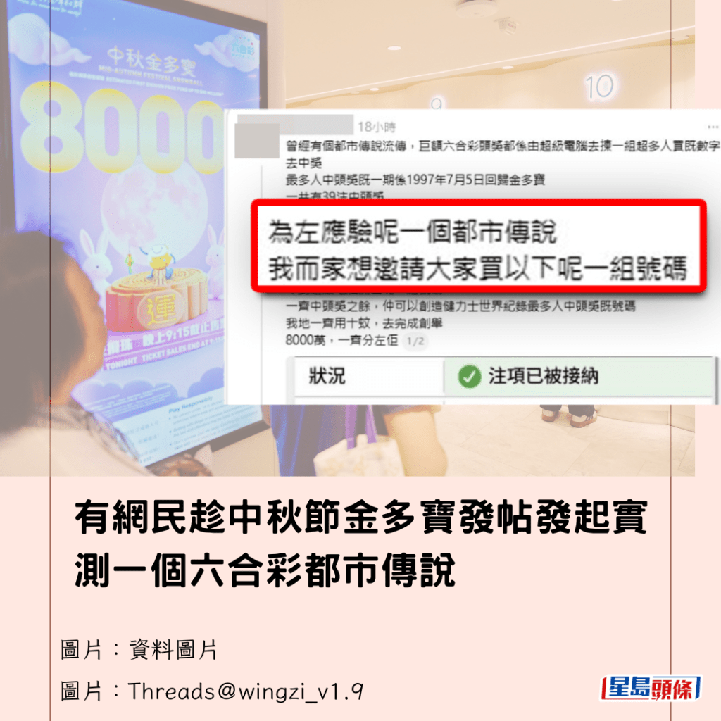 中秋節六合彩8000萬元金多寶昨晚(6日)攪珠,原來有網民借這次金多寶,測試一個六合彩「最易中買法」的都市傳說。他指,傳聞該都市傳說曾在97年「回歸金多寶」時應驗,他發起逾100網民參與實測,結果隨昨晚攪珠揭盅,令網民大呼意外。