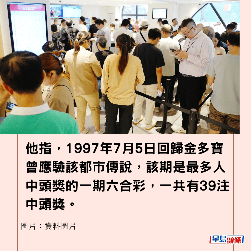 他指,1997年7月5日回歸金多寶曾應驗該都市傳說,該期是最多人中頭獎的一期六合彩,一共有39注中頭獎。