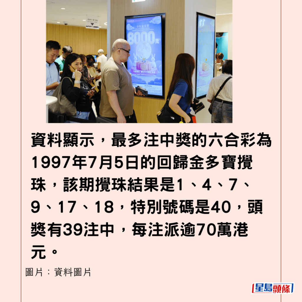 資料顯示,最多注中獎的六合彩為1997年7月5日的回歸金多寶攪珠,該期攪珠結果是1、4、7、9、17、18,特別號碼是40,頭獎有39注中,每注派逾70萬港元。
