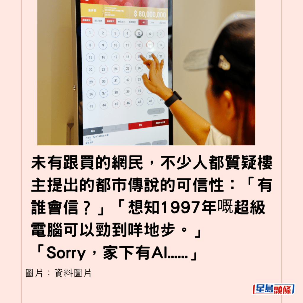 未有跟買的網民,不少人都質疑樓主提出的都市傳說的可信性:「有誰會信?」「想知1997年嘅超級電腦可以勁到咩地步。」「Sorry,家下有AI……」
