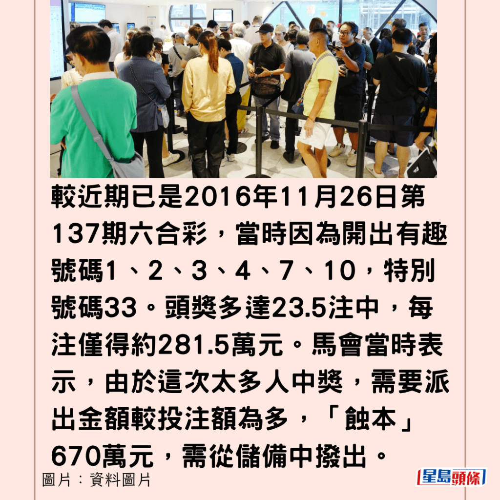 較近期已是2016年11月26日第137期六合彩,當時因為開出有趣號碼1、2、3、4、7、10,特別號碼33。頭獎多達23.5注中,每注僅得約281.5萬元。馬會當時表示,由於這次太多人中獎,需要派出金額較投注額為多,「蝕本」670萬元,需從儲備中撥出。