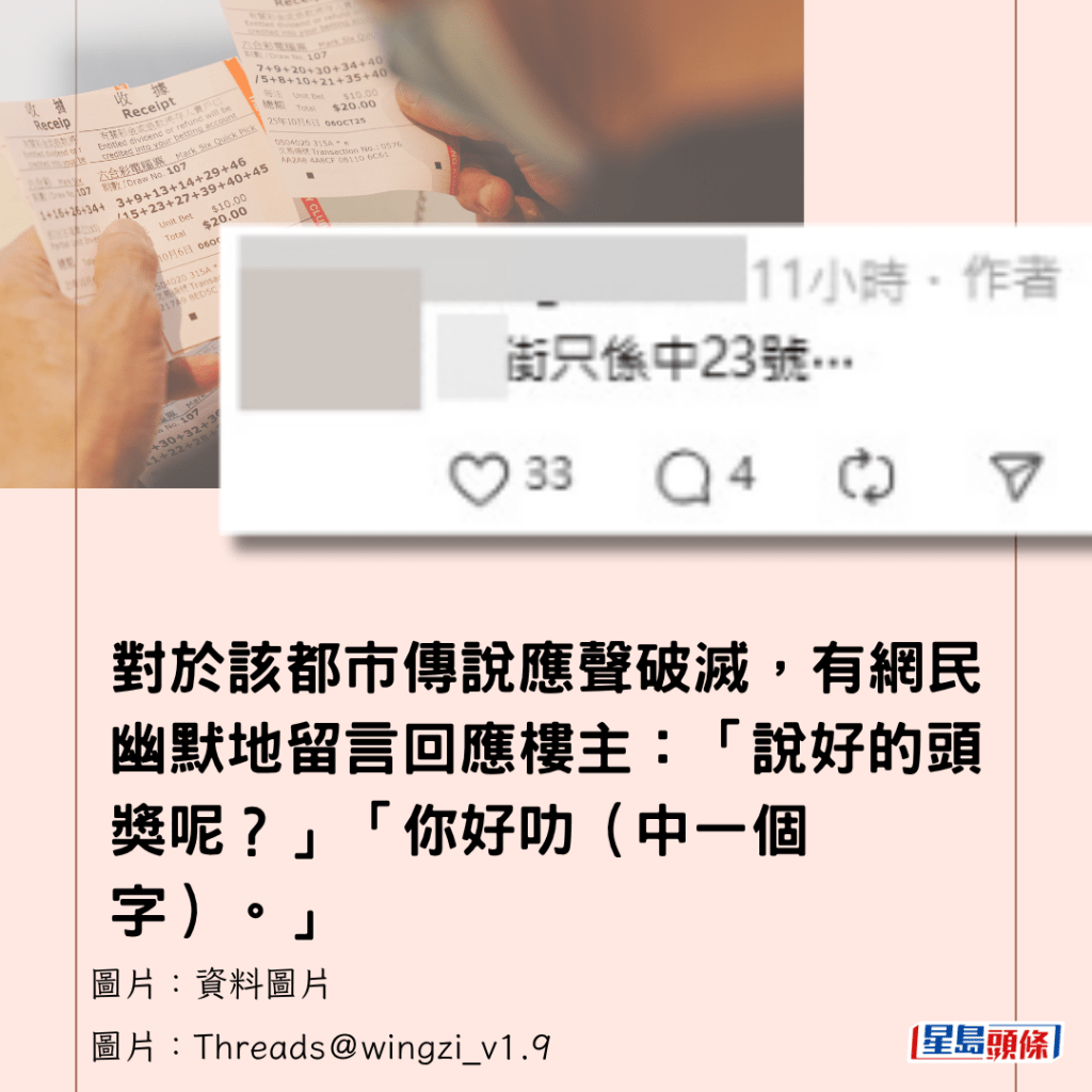 對於該都市傳說應聲破滅,有網民幽默地留言回應樓主:「說好的頭獎呢?」「你好叻(中一個字)。」