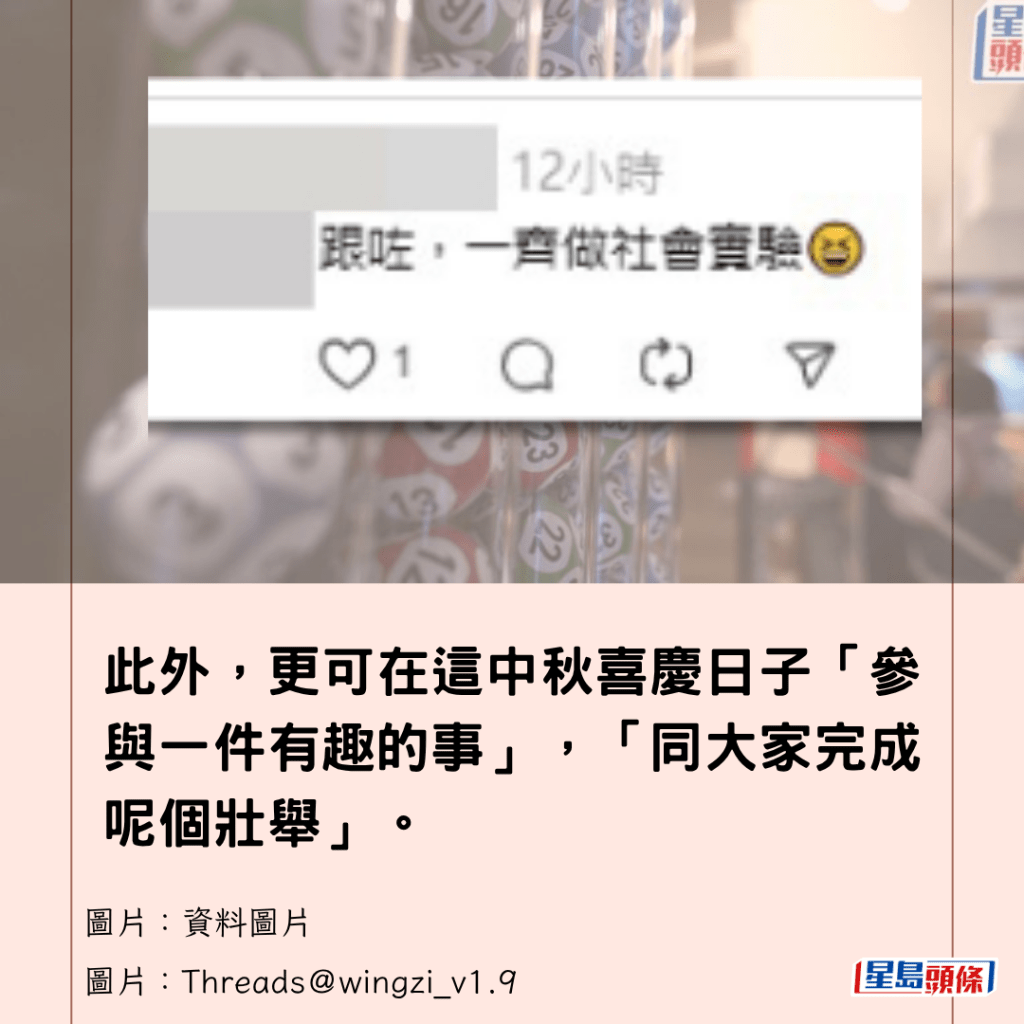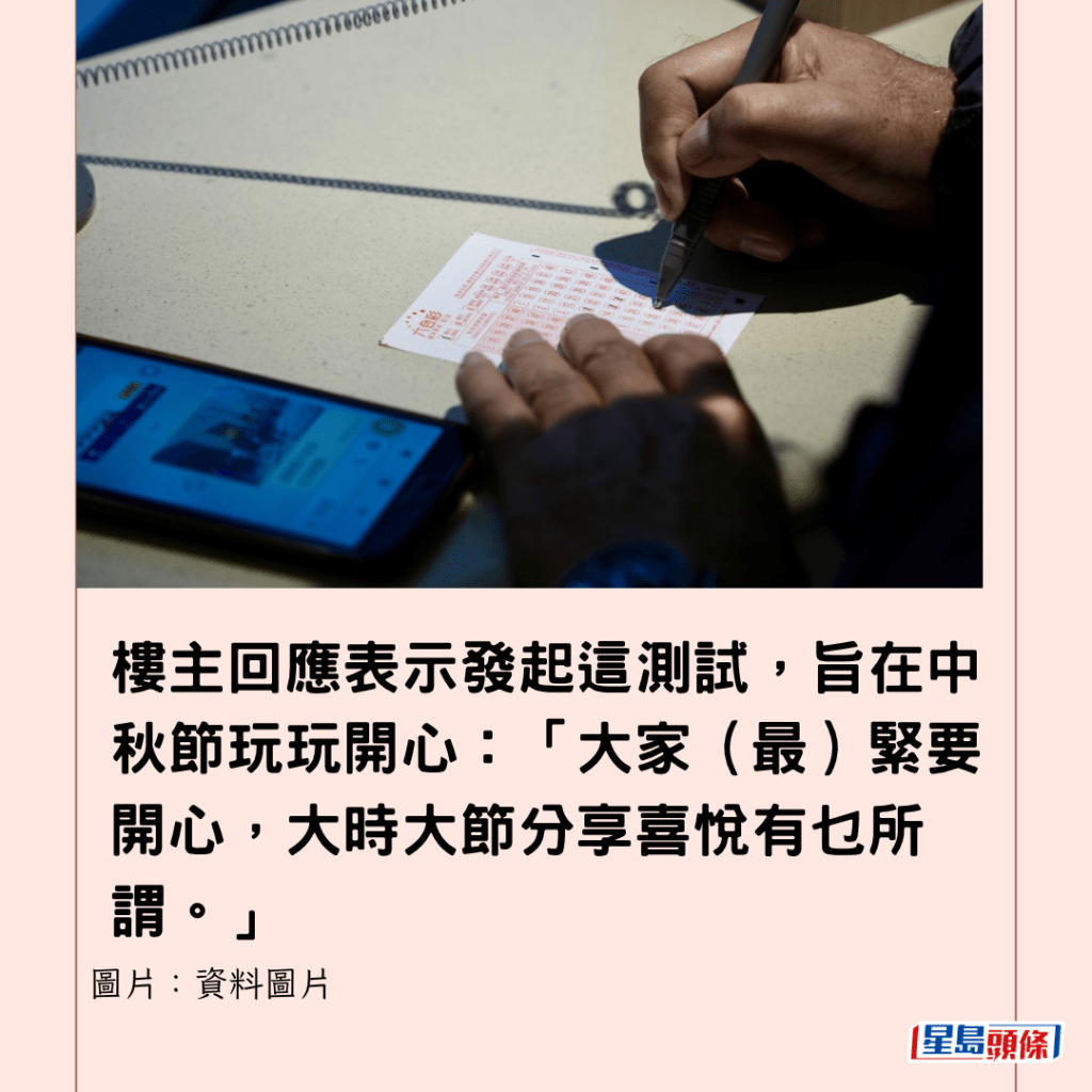 樓主回應表示發起這測試,旨在中秋節玩玩開心:「大家(最)緊要開心,大時大節分享喜悅有乜所謂。」