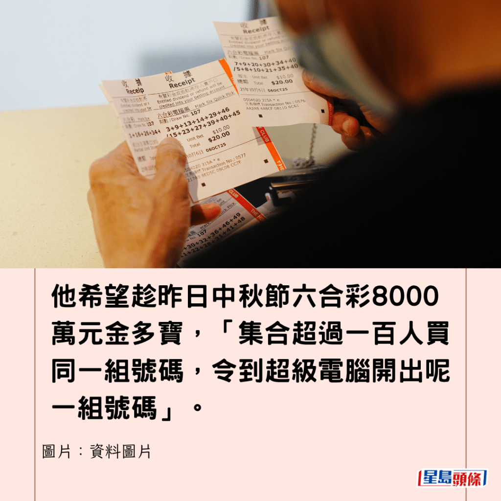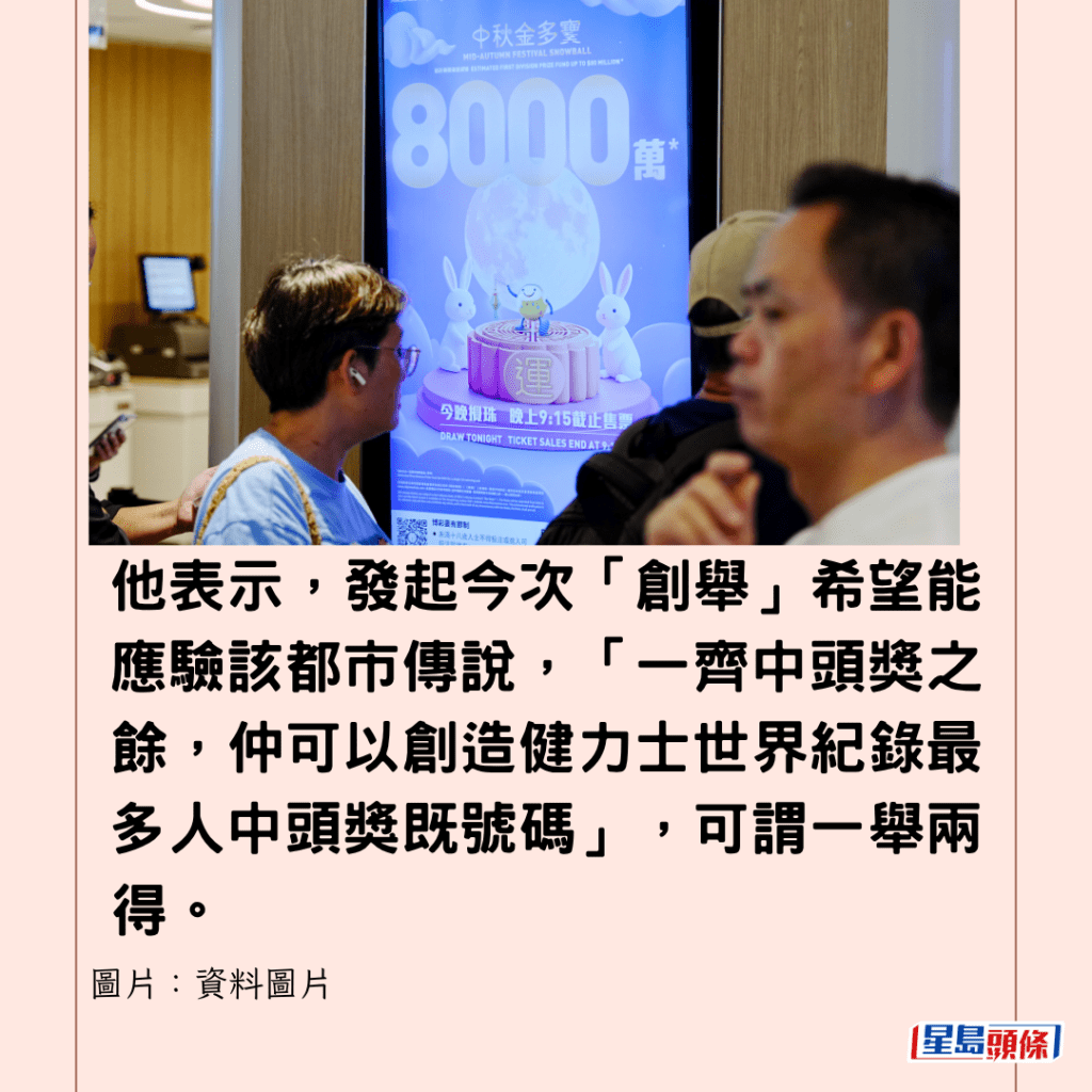 他希望趁昨日中秋節六合彩8000萬元金多寶,「集合超過一百人買同一組號碼,令到超級電腦開出呢一組號碼」。他表示,發起今次「創舉」希望能應驗該都市傳說,「一齊中頭獎之餘,仲可以創造健力士世界紀錄最多人中頭獎既號碼」,可謂一舉兩得。