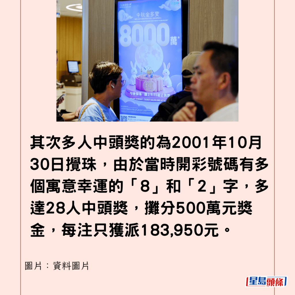 其次多人中頭獎的為2001年10月30日攪珠,由於當時開彩號碼有多個寓意幸運的「8」和「2」字,多達28人中頭獎,攤分500萬元獎金,每注只獲派183,950元。