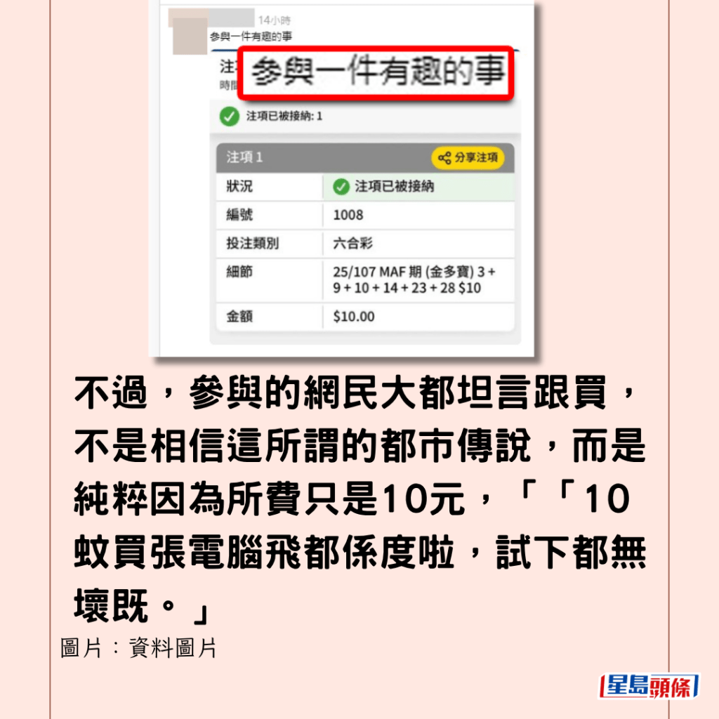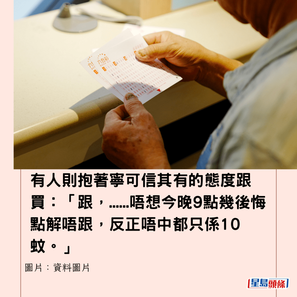有人則抱著寧可信其有的態度跟買:「跟,……唔想今晚9點幾後悔點解唔跟,反正唔中都只係10蚊。」