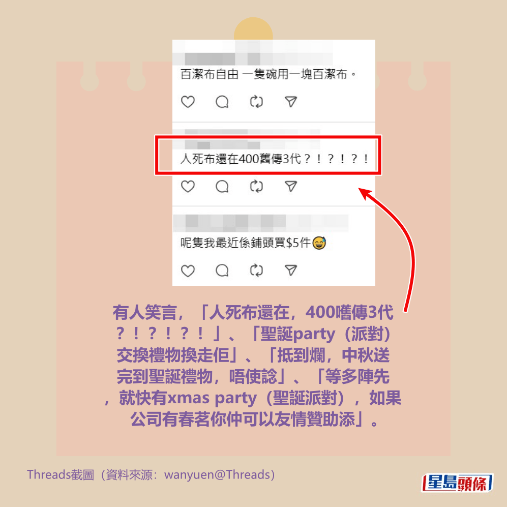 有人笑言,「人死布還在,400嚿傳3代?!?!?!」、「聖誕party(派對)交換禮物換走佢」、「抵到爛,中秋送完到聖誕禮物,唔使諗」、「等多陣先,就快有xmas party(聖誕派對),如果公司有春茗你仲可以友情贊助添」。