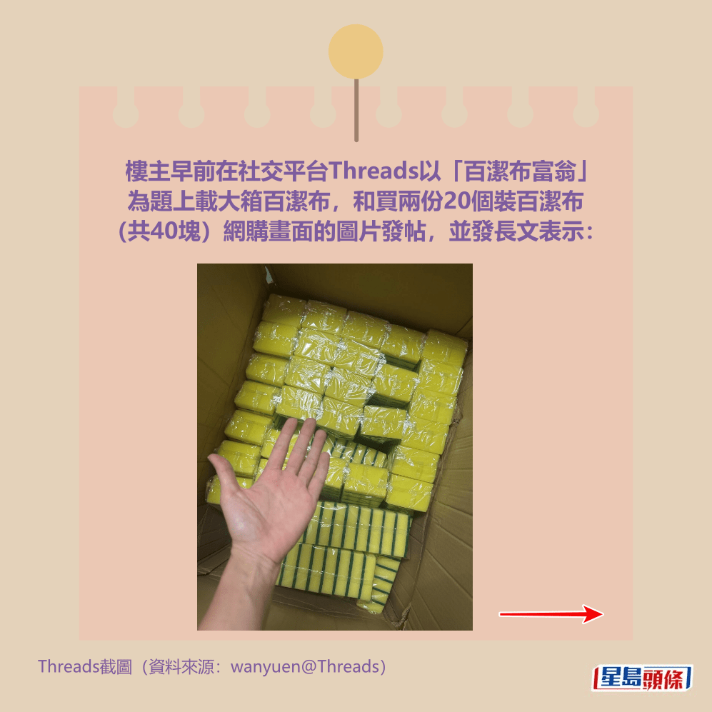 樓主早前在社交平台Threads以「百潔布富翁」為題上載大箱百潔布,和買兩份20個裝百潔布(共40塊)網購畫面的圖片發帖,並發長文表示: