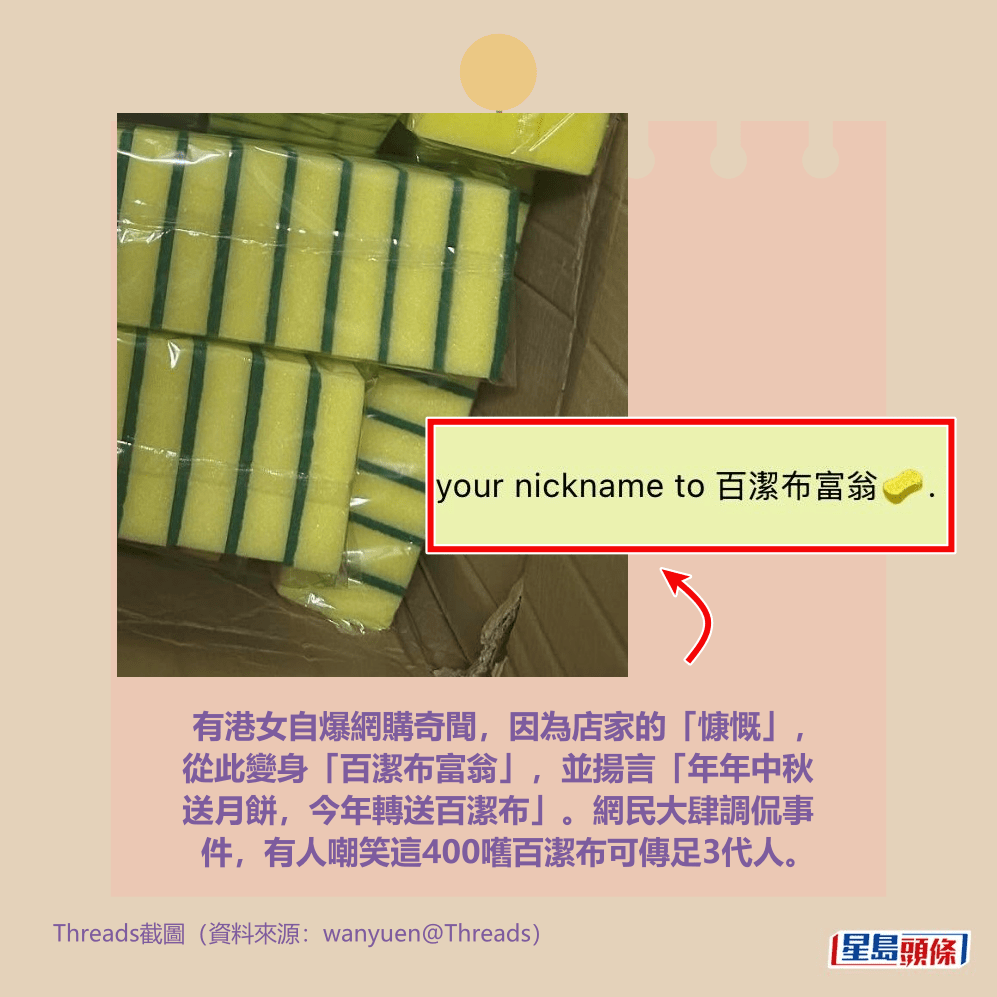 有港女自爆網購奇聞,因為店家的「慷慨」,從此變身「百潔布富翁」,並揚言「年年中秋送月餅,今年轉送百潔布」。網民大肆調侃事件,有人嘲笑這400嚿百潔布可傳足3代人。詳情見下圖及下文: