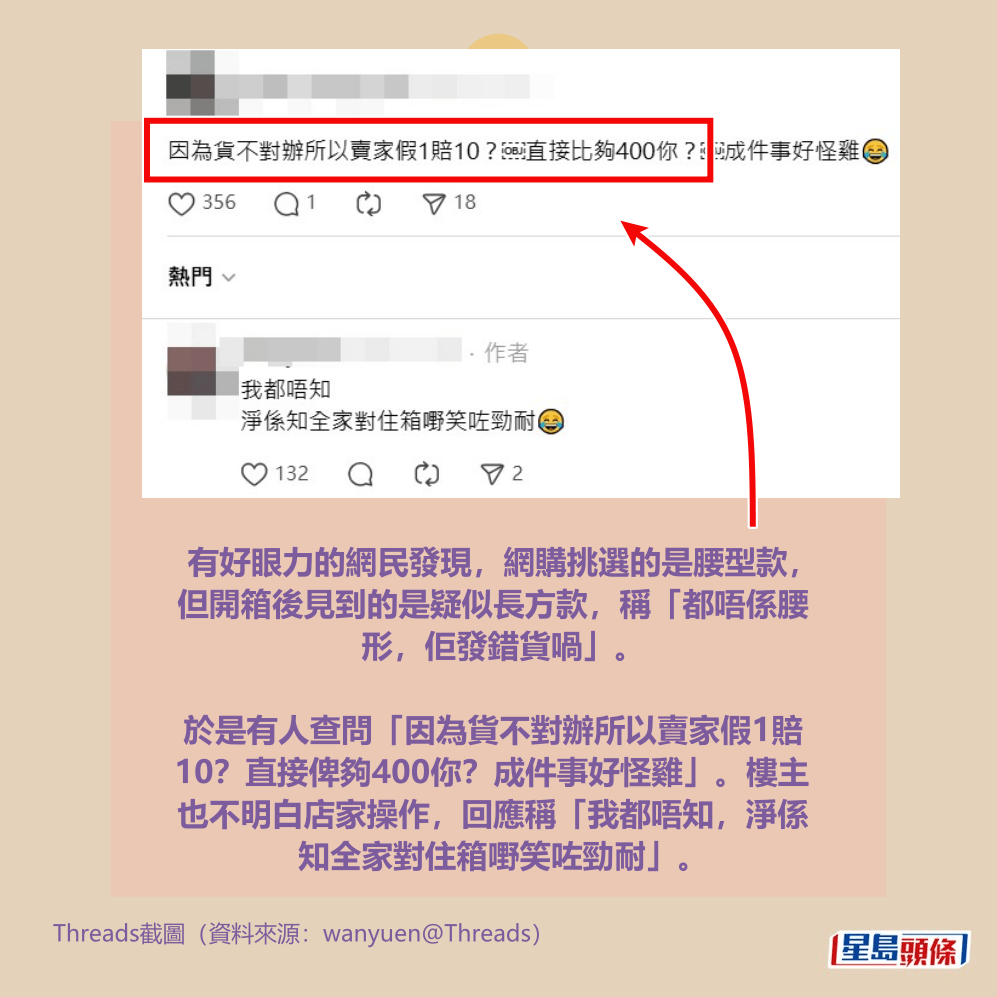 有好眼力的網民發現,網購挑選的是腰型款,但開箱後見到的是疑似長方款,稱「都唔係腰形,佢發錯貨喎」、「都唔係腰型裝嘅?佢寄錯咗貨俾你喎」、「係好似寄錯款式俾你爸爸喎,佢係要腰型款」。