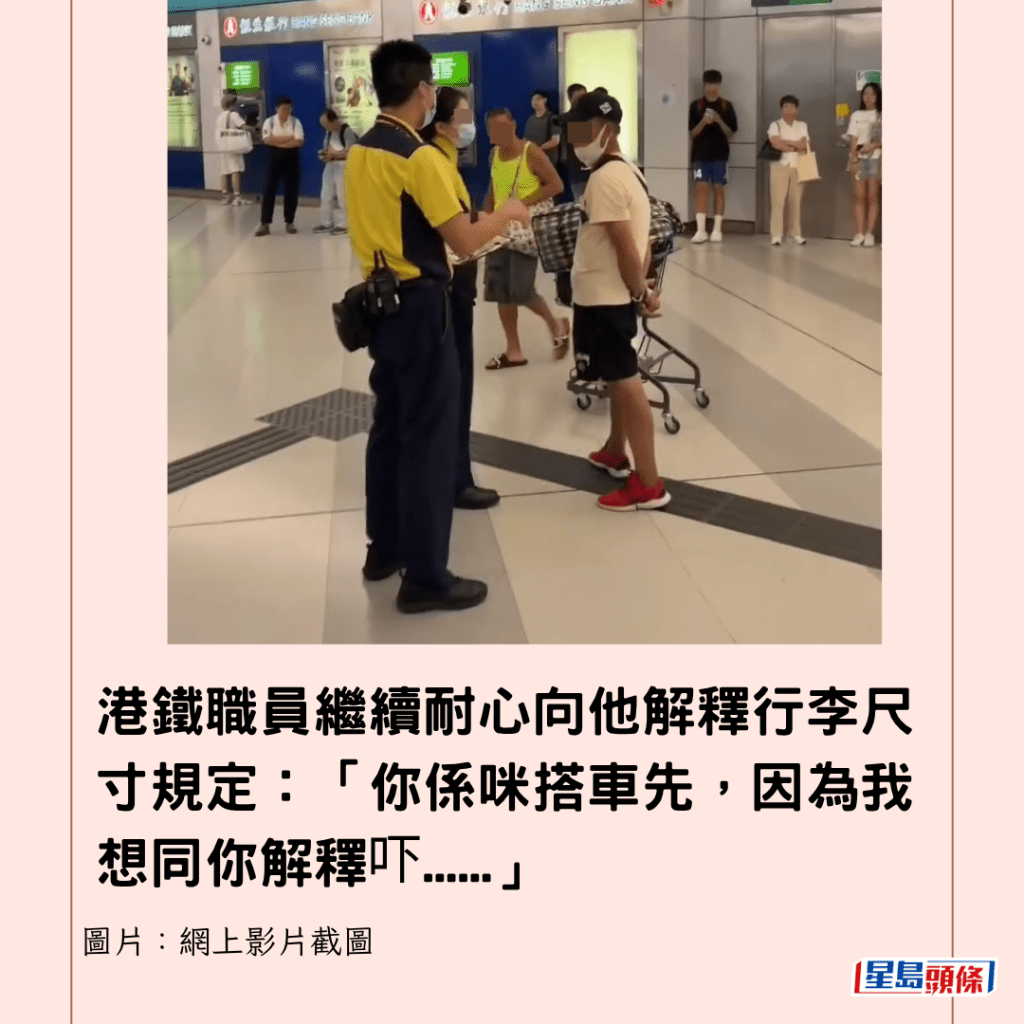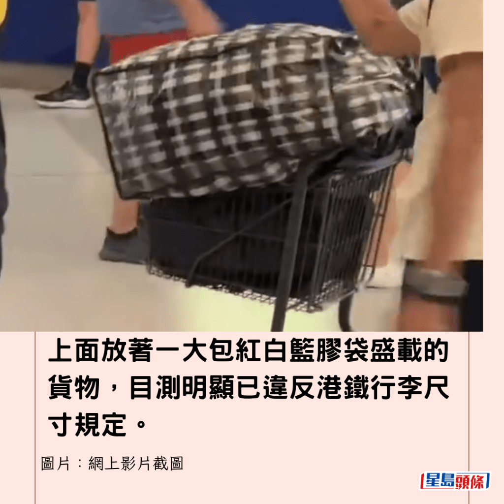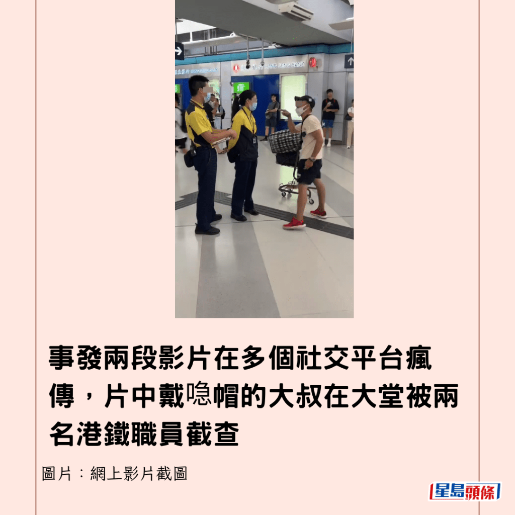 事發兩段影片在多個社交平台瘋傳,片中戴喼帽的大叔在大堂被兩名港鐵職員截查,大叔身旁放有一部超市手推車,上面放著一大包紅白籃膠袋盛載的貨物,目測明顯已違反港鐵行李尺寸規定。