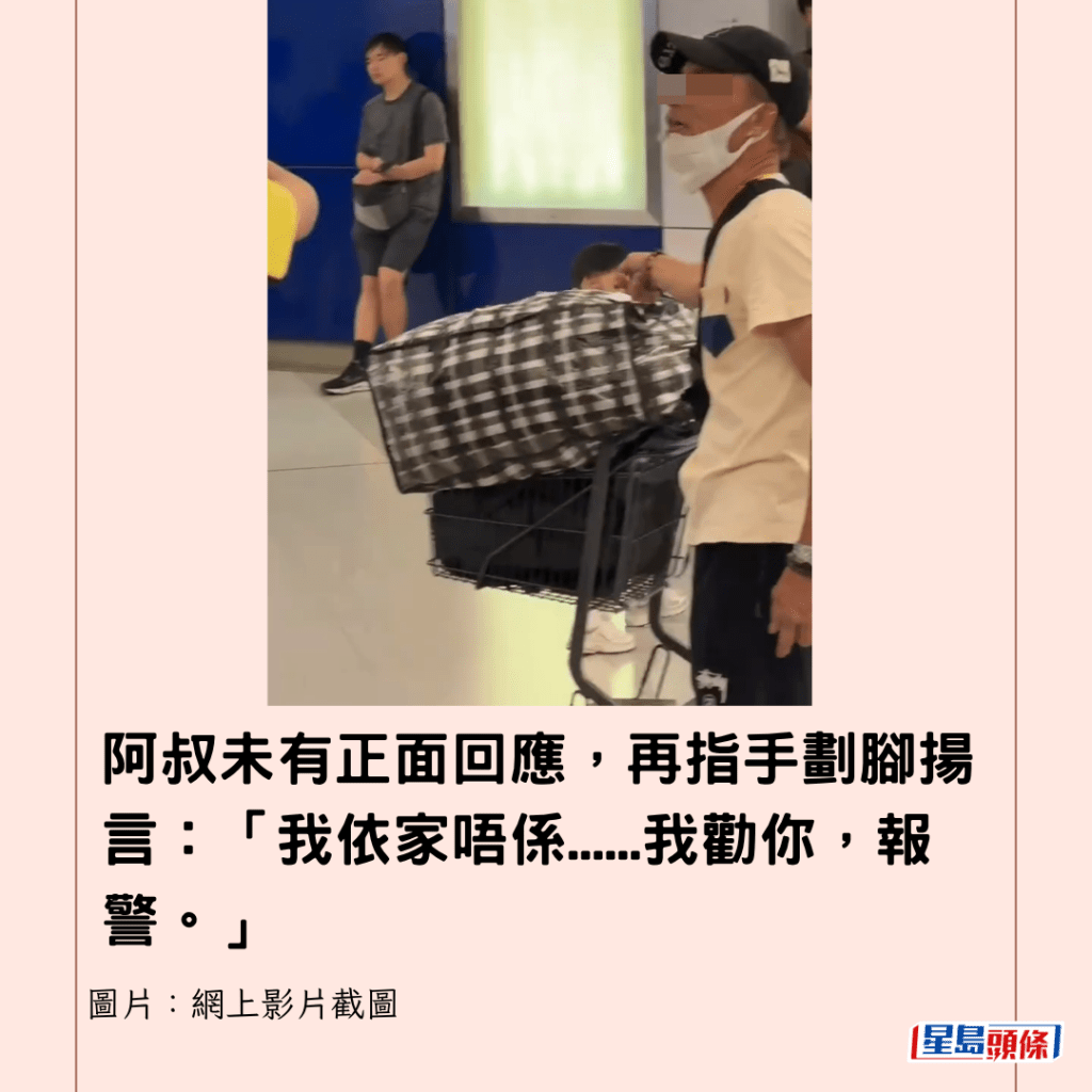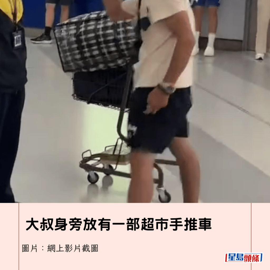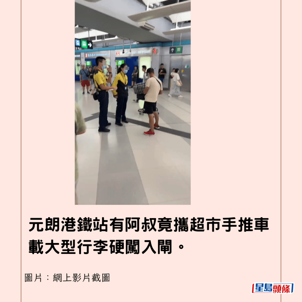 事發兩段影片在多個社交平台瘋傳,片中戴喼帽的大叔在大堂被兩名港鐵職員截查,大叔身旁放有一部超市手推車,上面放著一大包紅白籃膠袋盛載的貨物,目測明顯已違反港鐵行李尺寸規定。