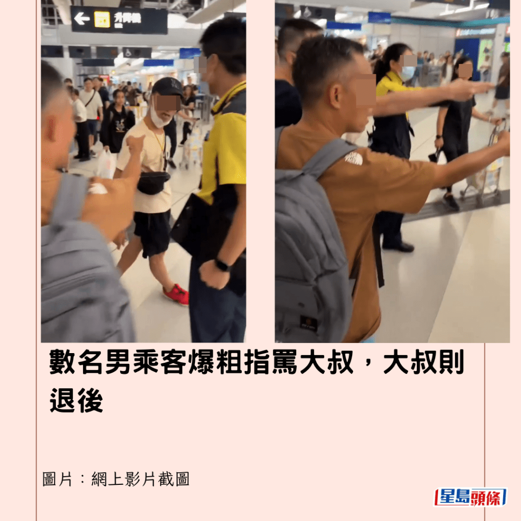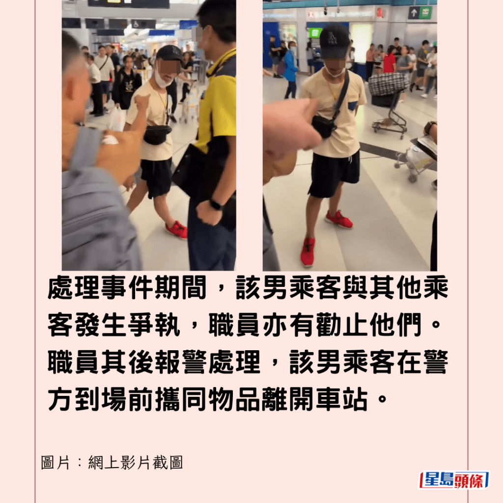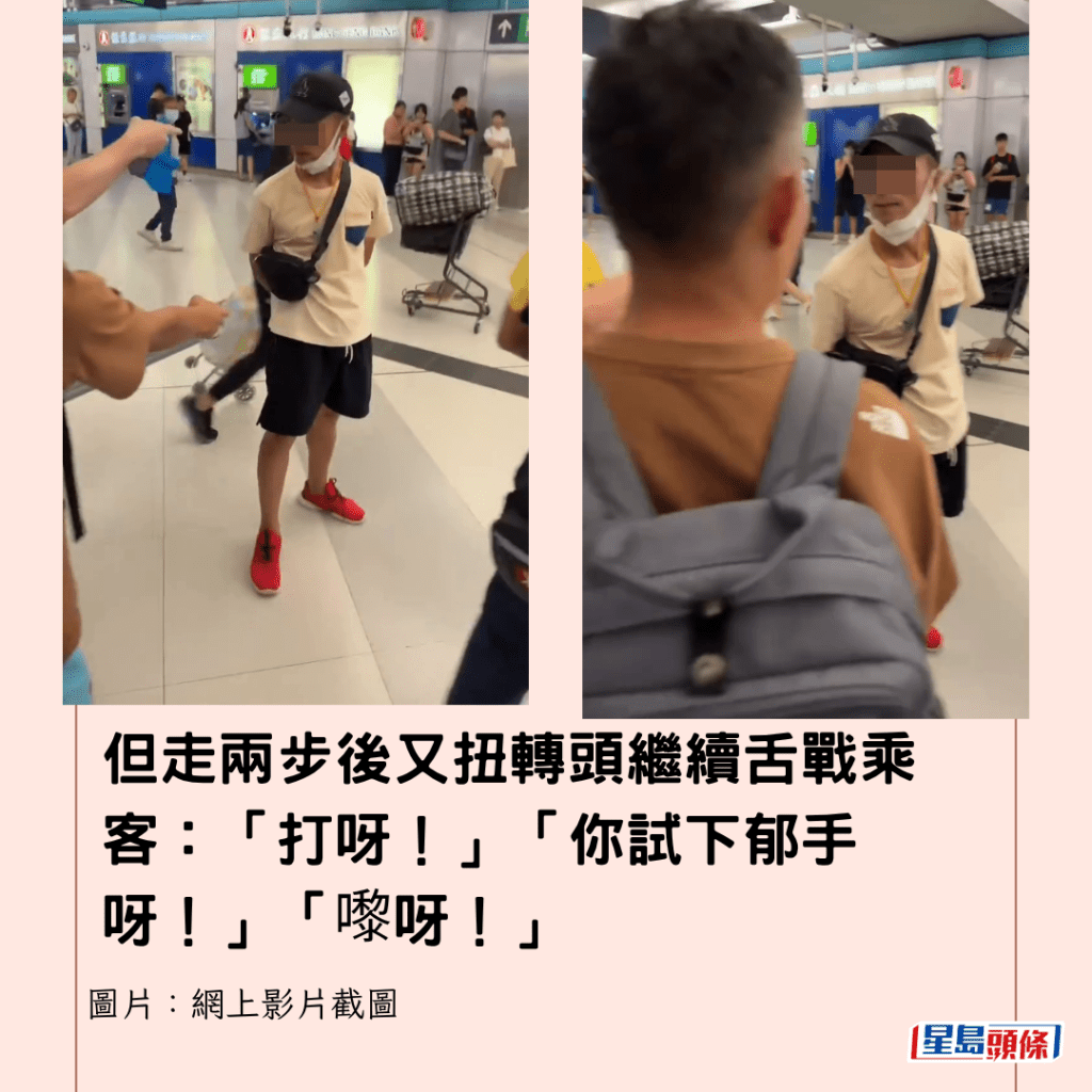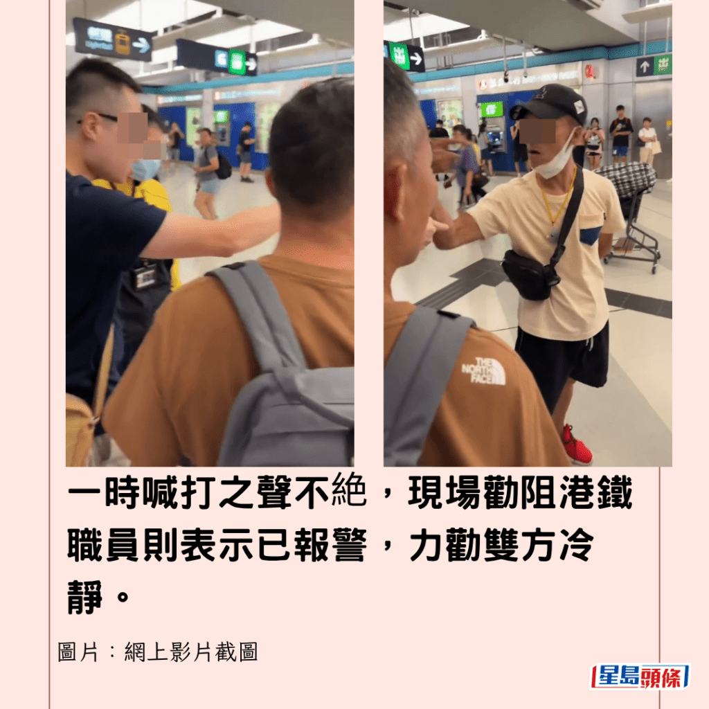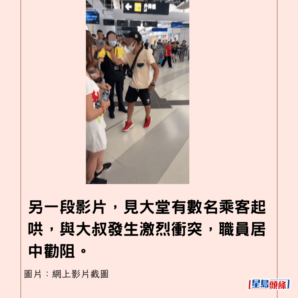 另一段影片,見大堂有數名乘客起哄,與大叔發生激烈衝突,職員居中勸阻。大叔走向起哄乘客怒喊:「你講咩呀!」數名男乘客爆粗指罵大叔,大叔則退後,但走兩步後又扭轉頭繼續舌戰乘客:「打呀!」「你試下郁手呀!」「嚟呀!」一時喊打之聲不絶,現場勸阻港鐵職員則表示已報警,力勸雙方冷靜。