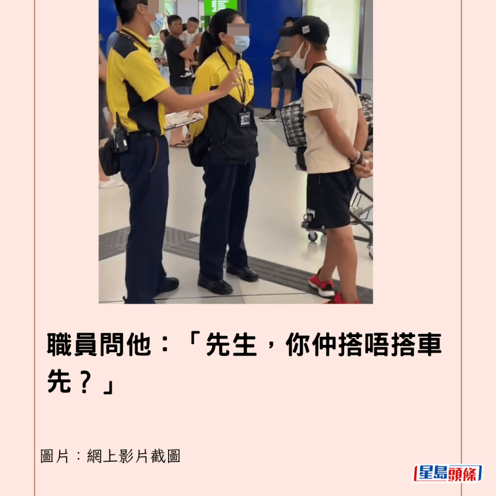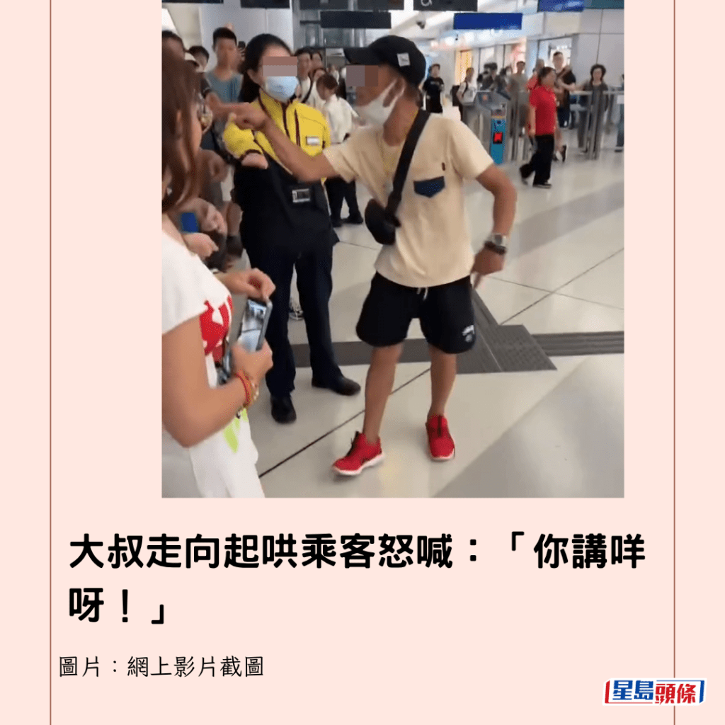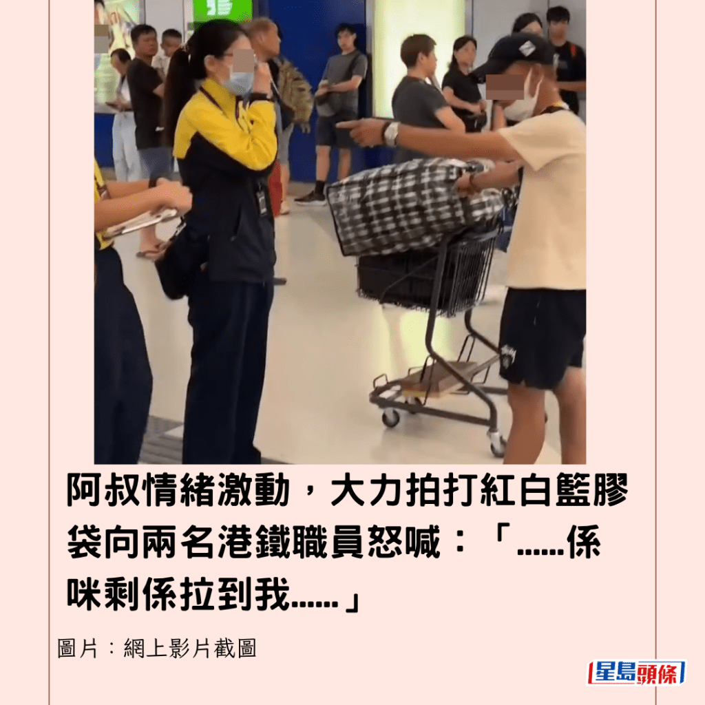 阿叔情緒激動,大力拍打紅白籃膠袋向兩名港鐵職員怒喊:「……係咪剩係拉到我……」職員問他:「先生,你仲搭唔搭車先?」