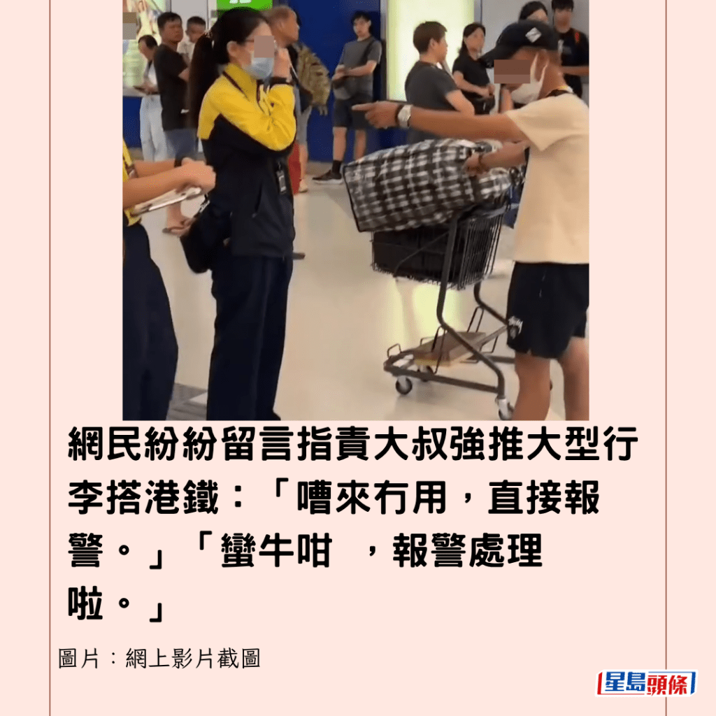 網民紛紛留言指責大叔強推大型行李搭港鐵:「嘈來冇用,直接報警。」「蠻牛咁 ,報警處理啦。」有人又質疑大叔的超市手推車來歷不明:「嗰架係超市手推車,明顯係偷咗嚟用?」