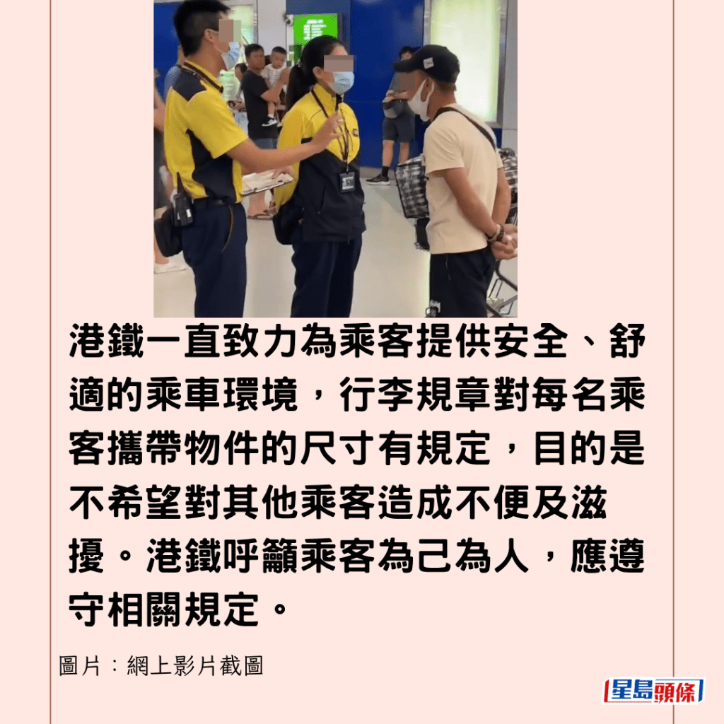 港鐵一直致力為乘客提供安全、舒適的乘車環境,行李規章對每名乘客攜帶物件的尺寸有規定,目的是不希望對其他乘客造成不便及滋擾。港鐵呼籲乘客為己為人,應遵守相關規定。