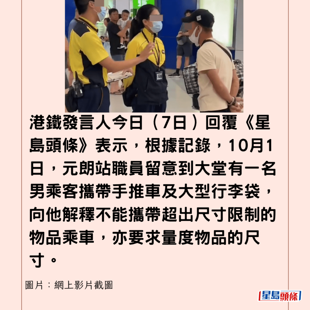 港鐵發言人今日(7日)回覆《星島頭條》表示,根據記錄,10月1日,元朗站職員留意到大堂有一名男乘客攜帶手推車及大型行李袋,向他解釋不能攜帶超出尺寸限制的物品乘車,亦要求量度物品的尺寸。處理事件期間,該男乘客與其他乘客發生爭執,職員亦有勸止他們。職員其後報警處理,該男乘客在警方到場前攜同物品離開車站。