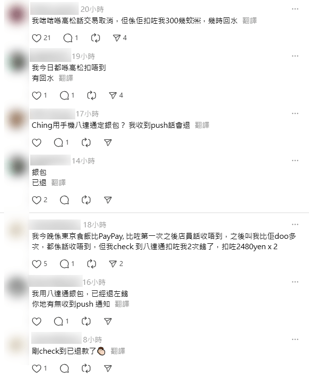 事實上,有類似經歷的用戶不在少數,有人回覆帖文稱「今日6點福岡買嘢八達通扣左我兩次錢,但店舖收唔到,最後要自己比現金」、「夜晚七點幾,用左兩次都唔得。最後我用番suica!最興係張八達通扣左兩次錢。請問有無得投訴同申請退款?返香港搞」。