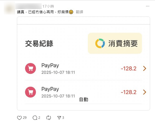 有人則表示在東京一間餐廳吃飯時以PayPay付款但不成功,直言失去信心,「比咗第一次之後店員話收唔到,之後叫我比佢嘟多次,都係話收唔到,但我Check 到八達通扣咗我2次錢了,扣咗2480yen x 2,講真已經冇信心再用,好麻煩」。
