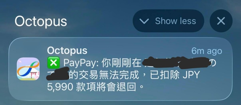 不少港人對八達通新增日本PayPay二維碼支付表示歡迎,不過服務推出不足一星期,有不少用戶表示昨天(7日)未能成功支付。一名港人於Threads發文,稱在大阪關西機場落機後到便利店購買零食,本想試用八達通PayPay支付,惟掃碼後系統彈出錯誤提示,只好臨時改用其他方式付款,事後卻發現八達通賬戶已被扣款,直呼「首次使用八達通PayPay大失敗」。該用戶續指,雖然金額不多,但不想白白損失,詢問該怎麼處理。