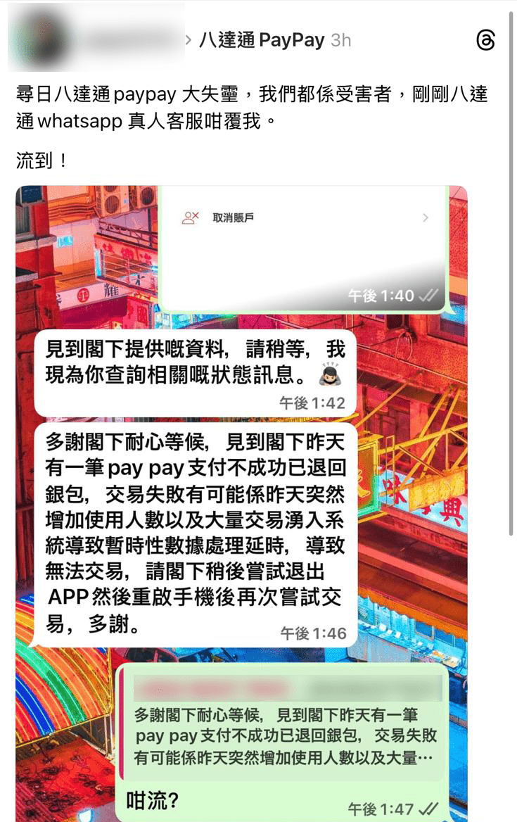 有用戶向八達通公司反映情況,客戶服務員回覆指「交易失敗有可能是昨天突然增加使用人數以及大量交易湧入系統,導致暫時性數據處理延時,導致無法交易」,並建議用戶稍後嘗試退出APP後重啟手機,然後再次嘗試交易。