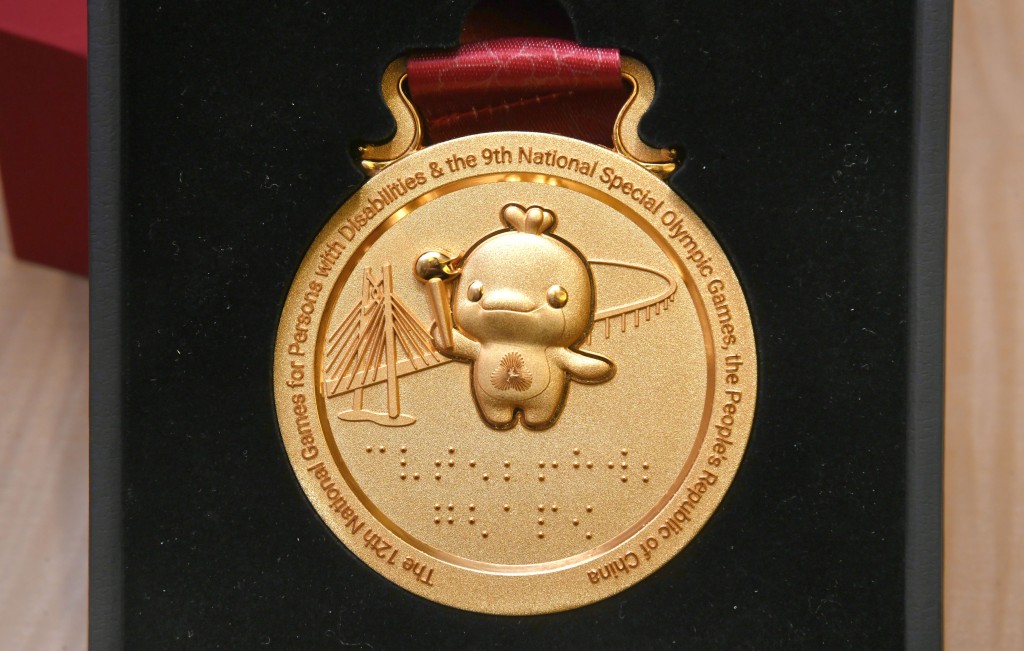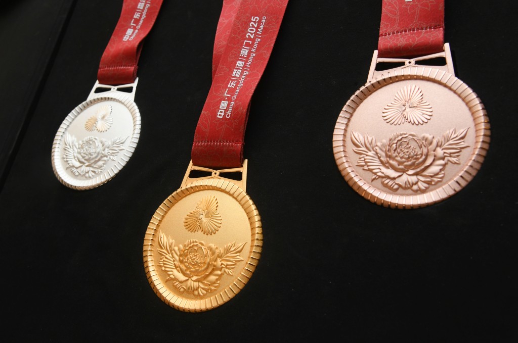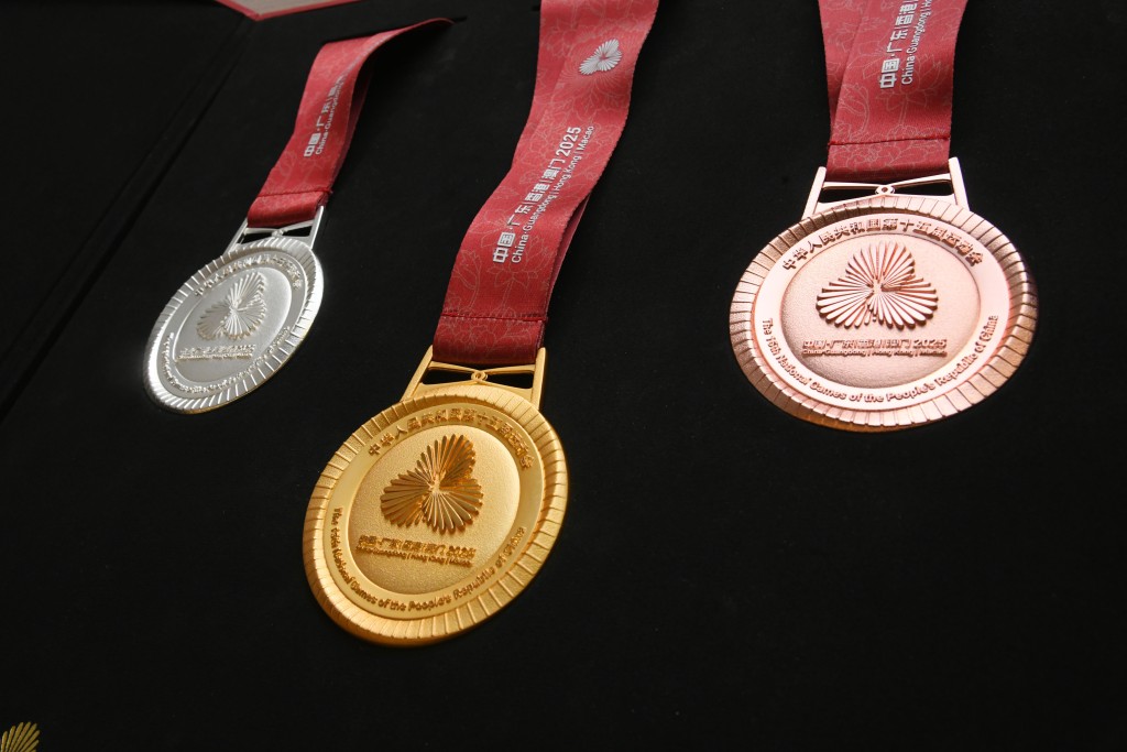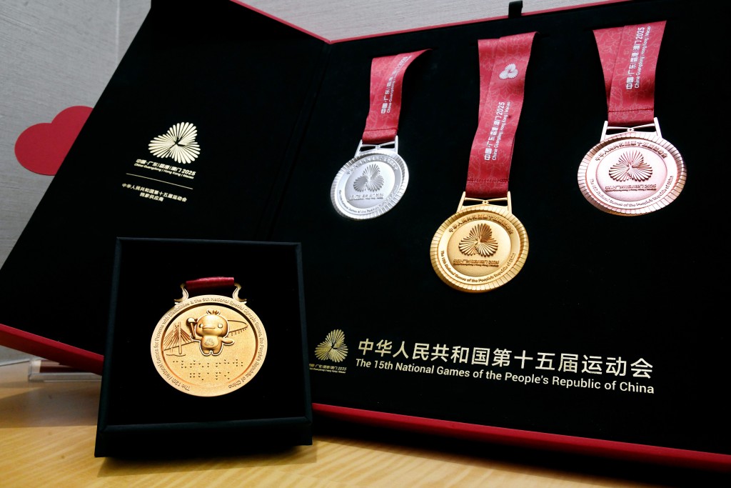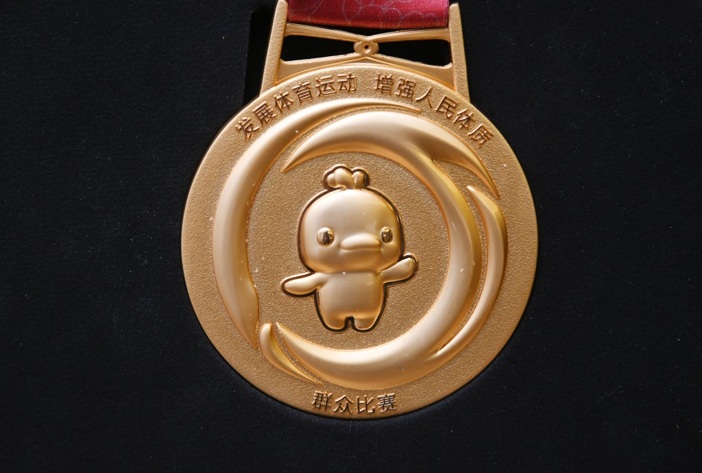 周大福珠寶集團創意中心高級經理、第十五屆全國運動會獎牌項目設計師黎偉傑表示,競體項目及群體項目獎牌的設計靈感均源自全運會的官方會徽,正面採用全運會會徽,外圍66條光線象徵全運會66年歷史,並融入「三水莫比烏斯環」設計,代表珠江、香江、濠江三江水元素,體現「三三不盡、六六無窮」的中國哲學。背面則展示吉祥物「喜洋洋」(中華白海豚)手持火炬,寓意體育精神薪火相傳。
