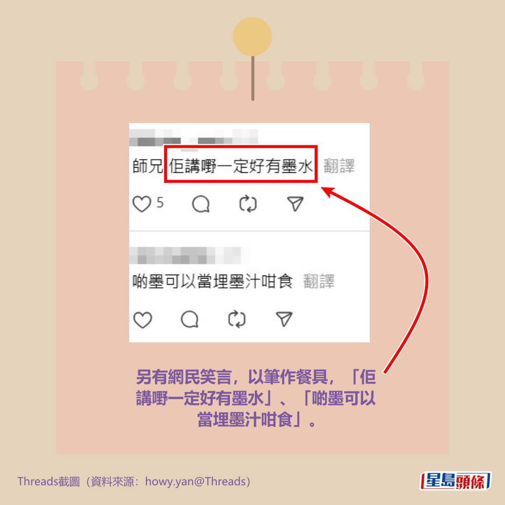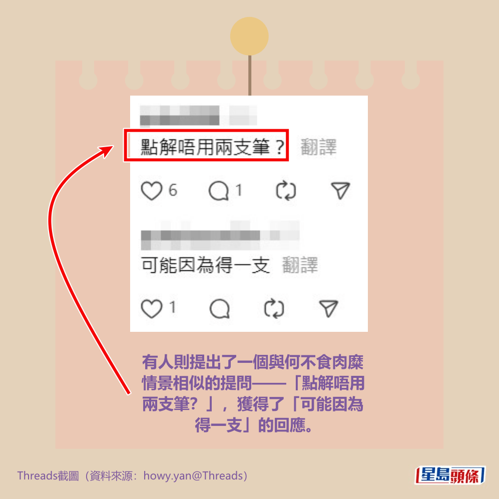 有人則提出了一個與何不食肉糜情景相似的提問——「點解唔用兩支筆?」,獲得了「可能因為得一支」的回應。另有網民笑言,以筆作餐具,「佢講嘢一定好有墨水」、「啲墨可以當埋墨汁咁食」。