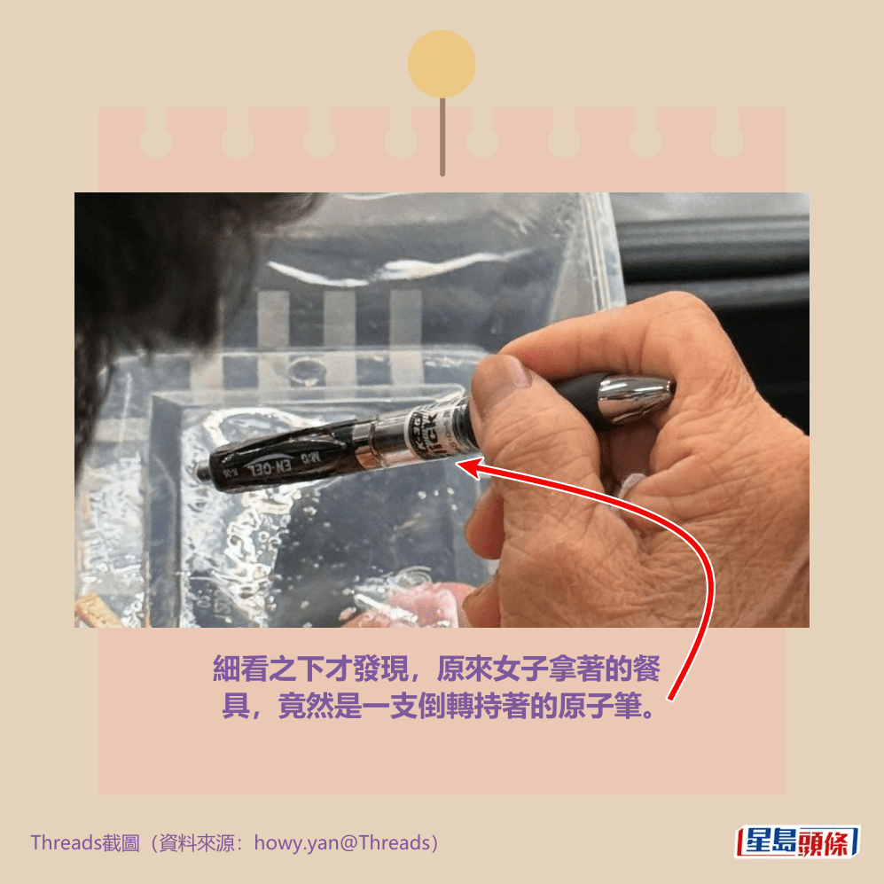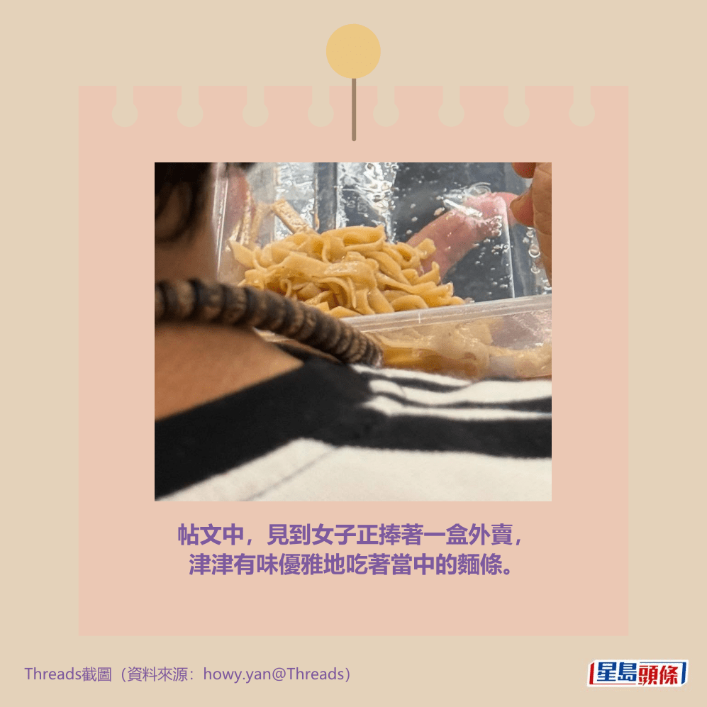 帖文中,見到女子正捧著一盒外賣,津津有味優雅地吃著當中的麵條。細看之下才發現,原來女子拿著的餐具,竟然是一支倒轉持著的原子筆。
