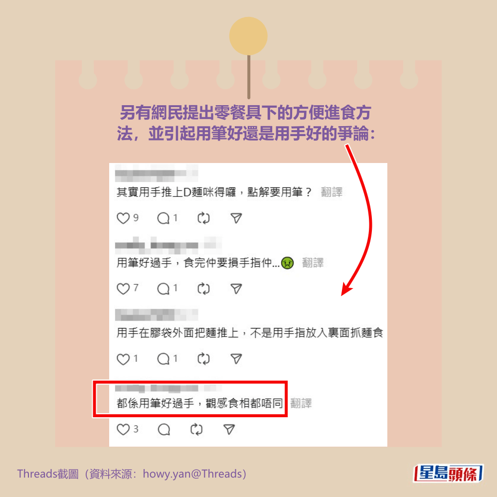 另有網民提出零餐具下的方便進食方法,並引起用筆好還是用手好的爭論: