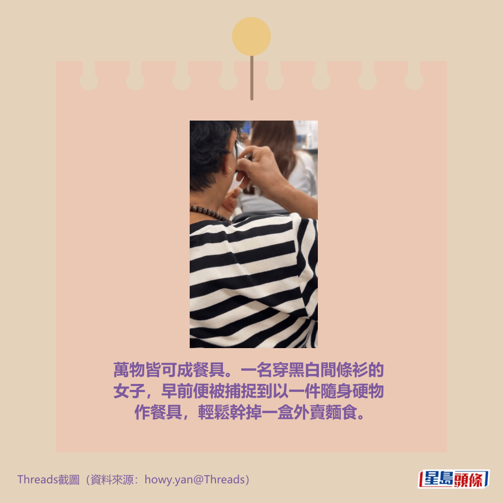 萬物皆可成餐具。一名穿黑白間條衫的女子,早前便被捕捉到以一件隨身硬物作餐具,輕鬆幹掉一盒外賣麵食。詳情見下圖及下文: