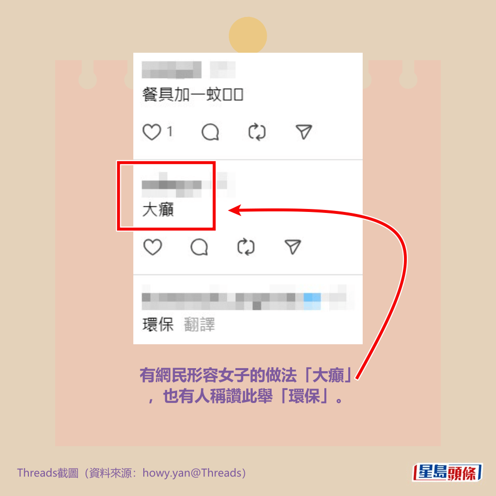 有網民形容女子的做法「大癲」,也有人稱讚此舉「環保」。但還是有人真切地感受到當中的無奈「人哋都係冇得揀先用筆」、「冇餐具係咁,點都好過用手啦 」。
