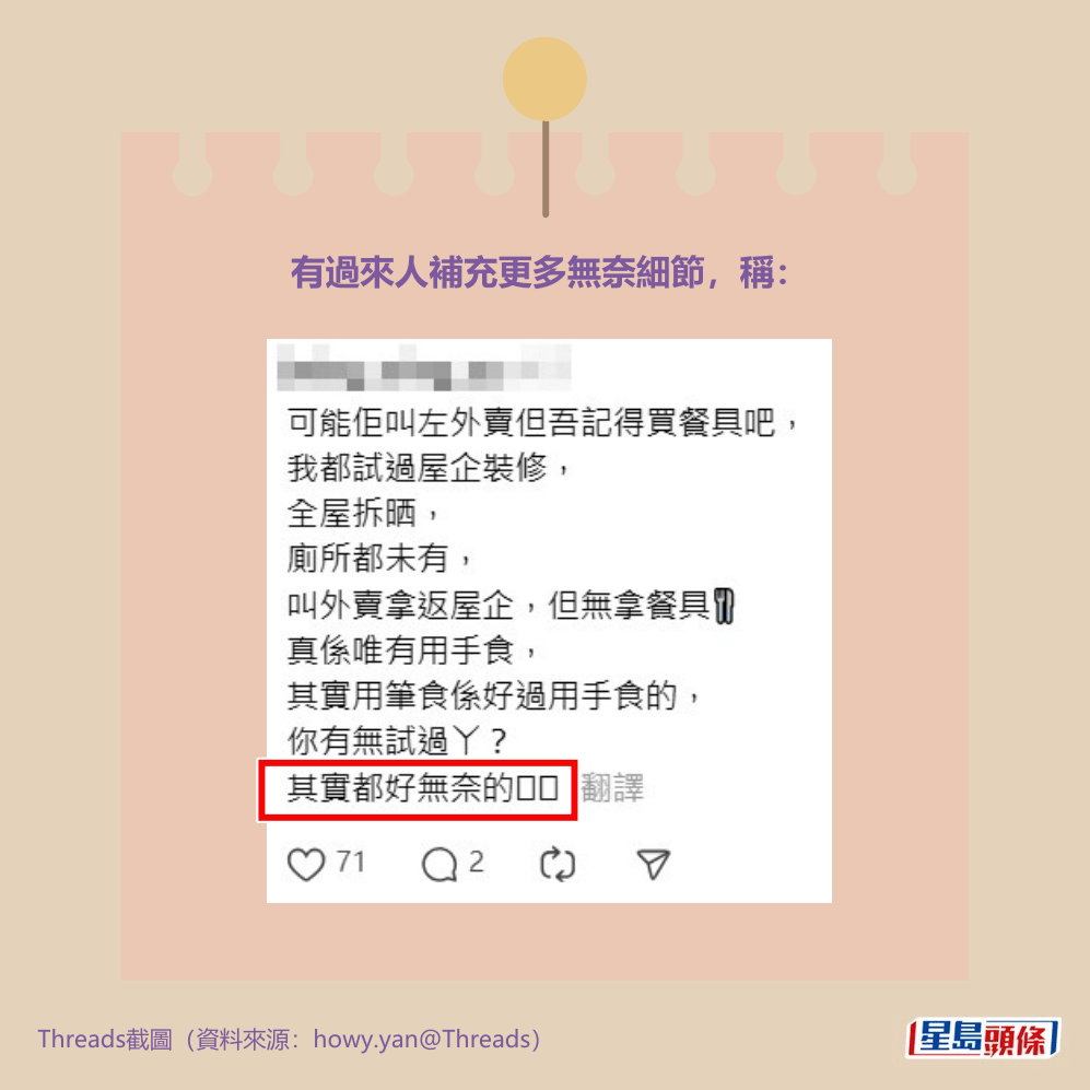 有過來人補充更多無奈細節,稱「可能佢叫咗外賣但唔記得買餐具吧,我都試過屋企裝修,全屋拆晒,廁所都未有,叫外賣拿返屋企,但無拿餐具,真係唯有用手食,其實用筆食係好過用手食的,你有無試過丫?其實都好無奈的」。