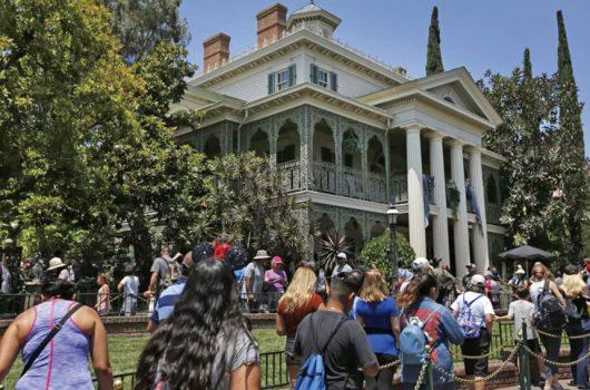 2017年,遊客在迪士尼樂園的鬼屋遊樂設施外排隊等候。洛杉磯時報