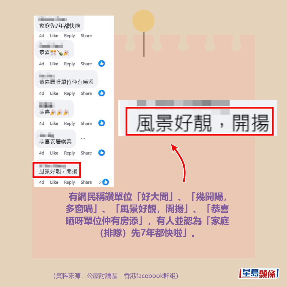 網民恭喜、賀安居樂業之聲不絕,不少人估計樓主的上樓屋邨為東涌新入伙屋邨翔東邨,指「似翔東」。有網民稱讚單位「好大間」、「幾開陽,多窗喎」、「風景好靚,開揚」、「恭喜晒呀單位仲有房添」,有人並認為「家庭(排隊)先7年都快啦」。