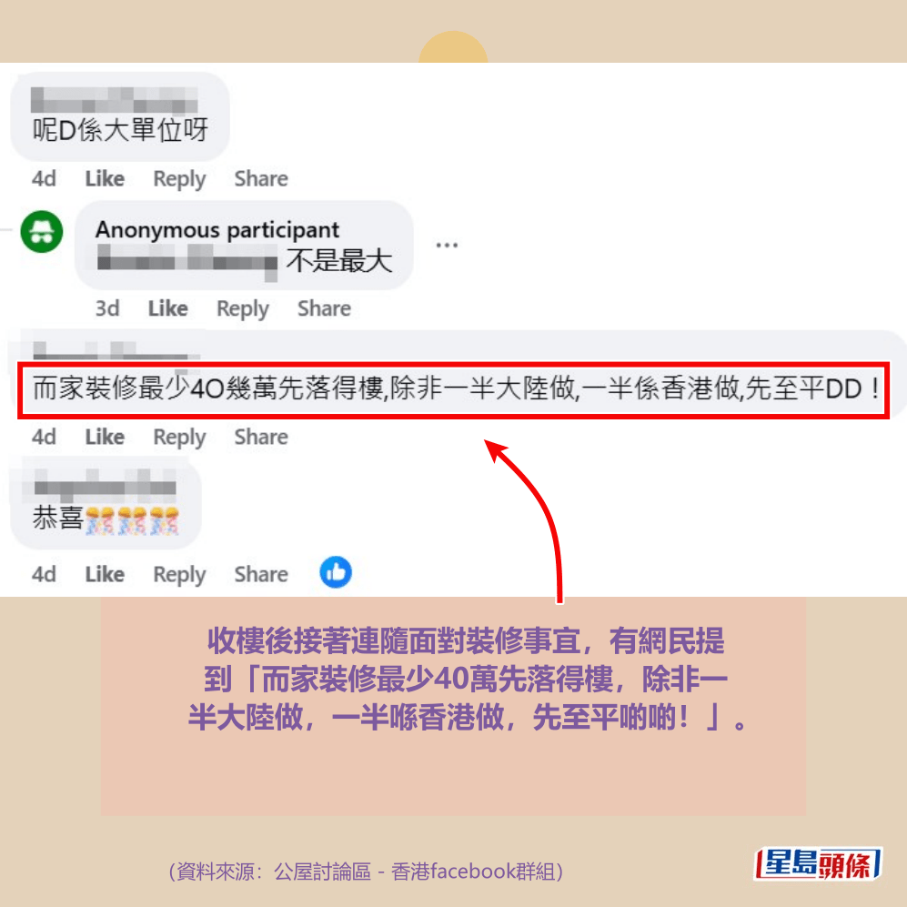 收樓後接著連隨面對裝修事宜,有網民提到「而家裝修最少40萬先落得樓,除非一半大陸做,一半喺香港做,先至平啲啲!」。