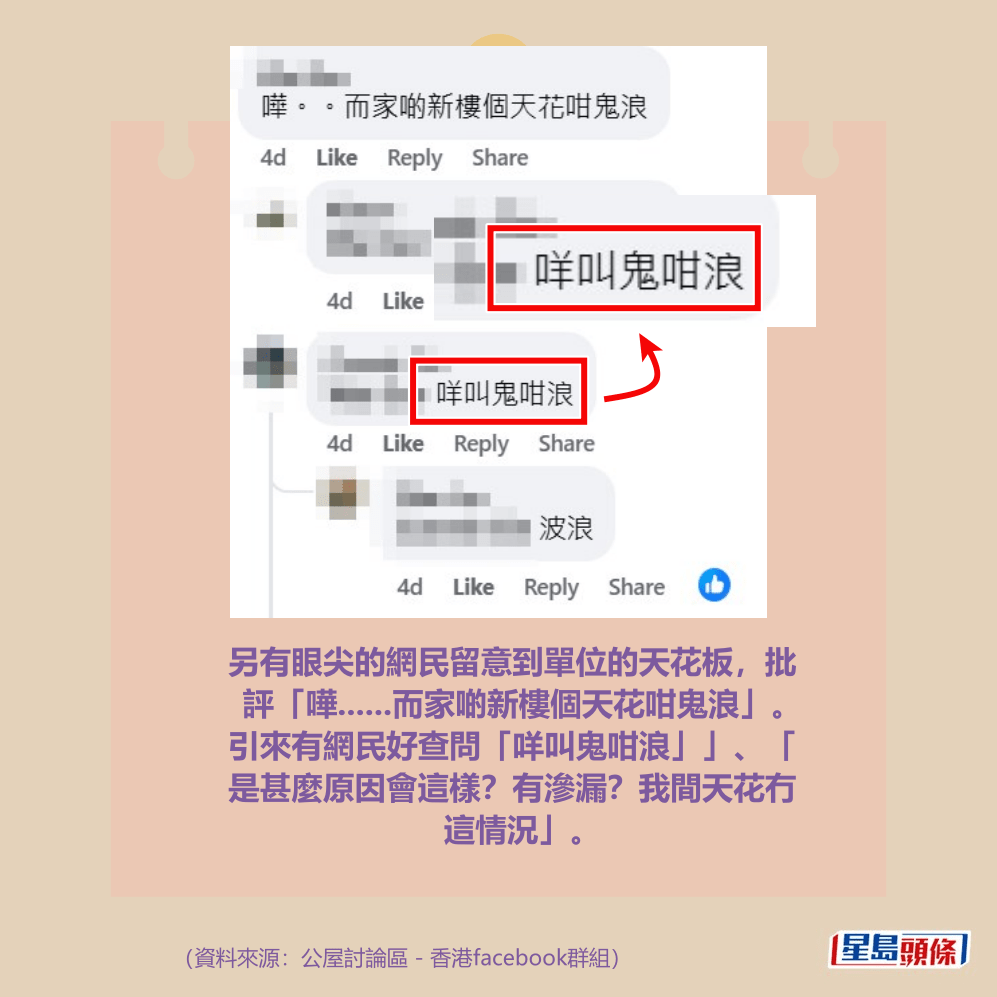 另有眼尖的網民留意到單位的天花板,批評「嘩……而家啲新樓個天花咁鬼浪」。引來有網民好查問「咩叫鬼咁浪」」、「是甚麼原因會這樣?有滲漏?我間天花冇這情況」。