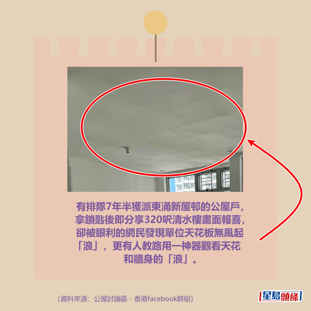 有排隊7年半獲派東涌新屋邨的公屋戶,拿鎖匙後即分享320呎清水樓畫面報喜,卻被眼利的網民發現單位天花板無風起「浪」,更有人教路用一神器觀看天花和牆身的「浪」。詳情見下圖及下文: