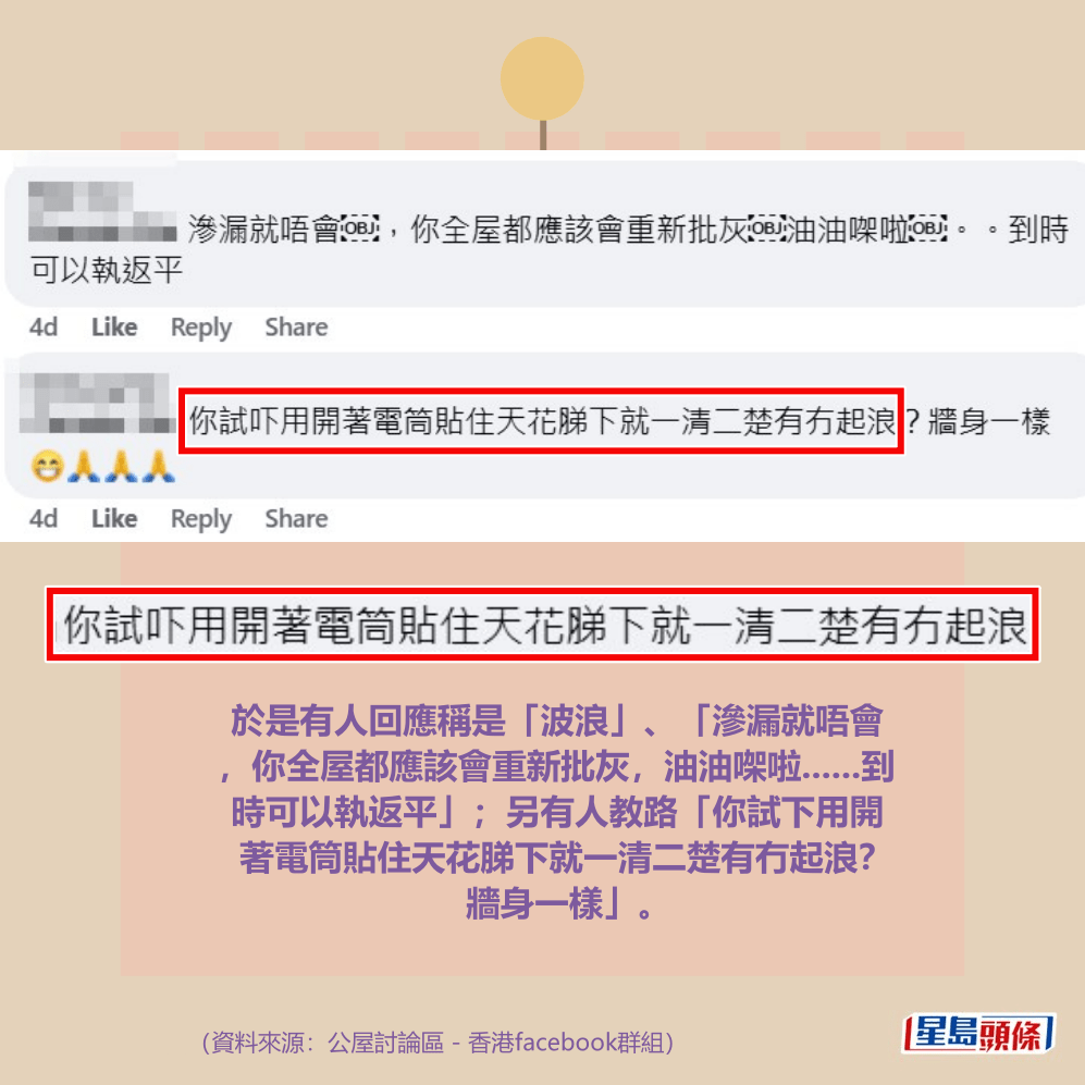 於是有人回應稱是「波浪」、「滲漏就唔會,你全屋都應該會重新批灰,油油㗎啦……到時可以執返平」;另有人教路「你試下用開著電筒貼住天花䏲下就一清二楚有冇起浪?牆身一樣」。