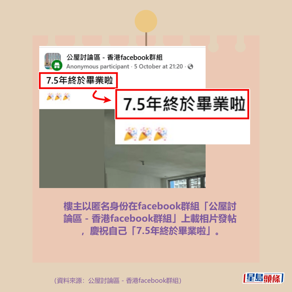 樓主以匿名身份在facebook群組「公屋討論區 – 香港facebook群組」上載相片發帖,慶祝自己「7.5年終於畢業啦」。
