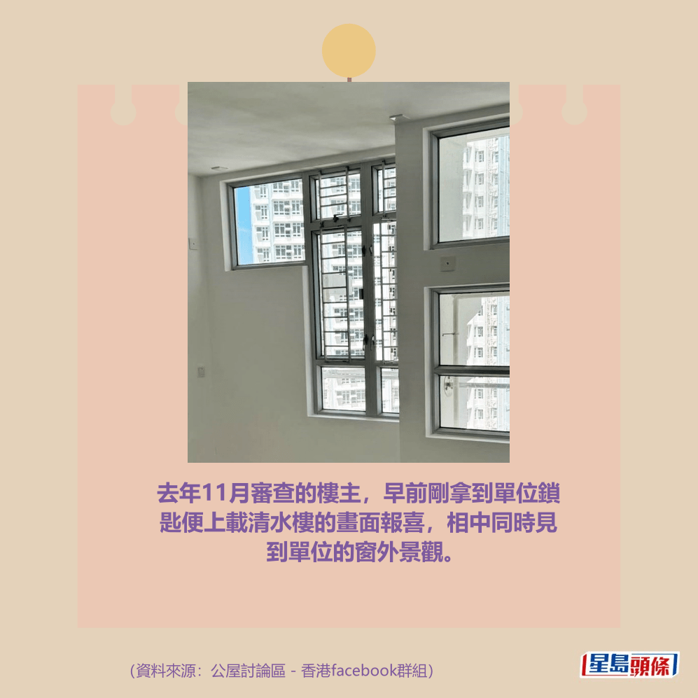 綜合樓主在回應網民時提供的資料,申請上樓排隊7年半後,獲派的安樂窩位於東涌,屬新屋邨,3人(無長者)單位大320呎。去年11月審查的樓主,早前剛拿到單位鎖匙便上載清水樓的畫面報喜,相中同時見到單位的窗外景觀。