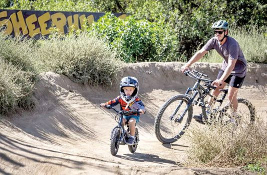 維達 (Tony Weeda) 在橙縣公園教導三歲兒子維達(Taj Weeda)騎自行車。洛杉磯時報