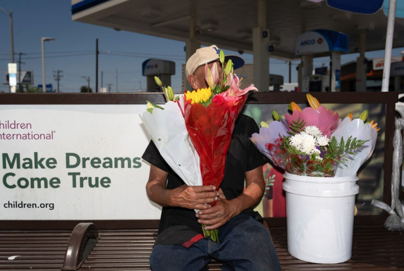 來自墨西哥的移民花販何塞8月坐在洛杉磯一家加油站外,臉上覆蓋著鮮花拍照。美聯社