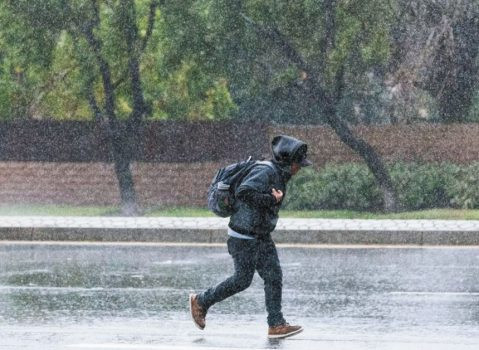 週二,一名行人在聖塔克拉里塔市的索萊達峽谷路上冒雨奔跑。洛杉磯時報