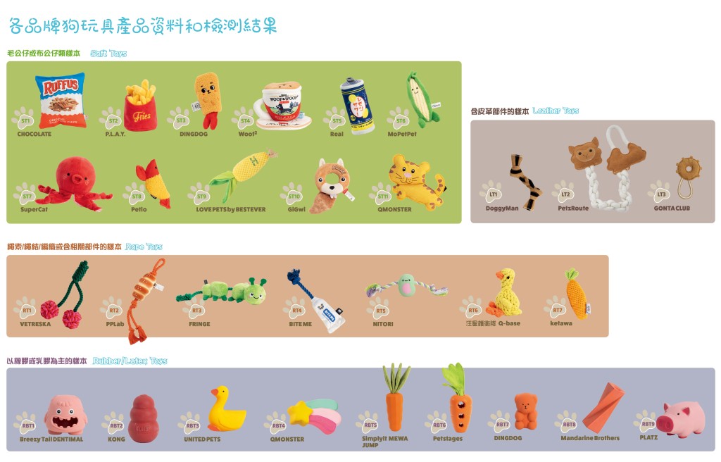 30 款來自多個品牌的狗玩具樣本分別從寵物用品店、家品店,以及網上商店購買,售價由30元至179元。樣本涵蓋4大主要類別,包括11款毛/布公仔、7款為繩索/繩結/編織或含相關部件的款式、9款以橡膠或乳膠為主的款式,以及3款含皮革部件的款式;當中6款樣本聲稱可供狗主將寵物零食放入內讓狗隻探索。