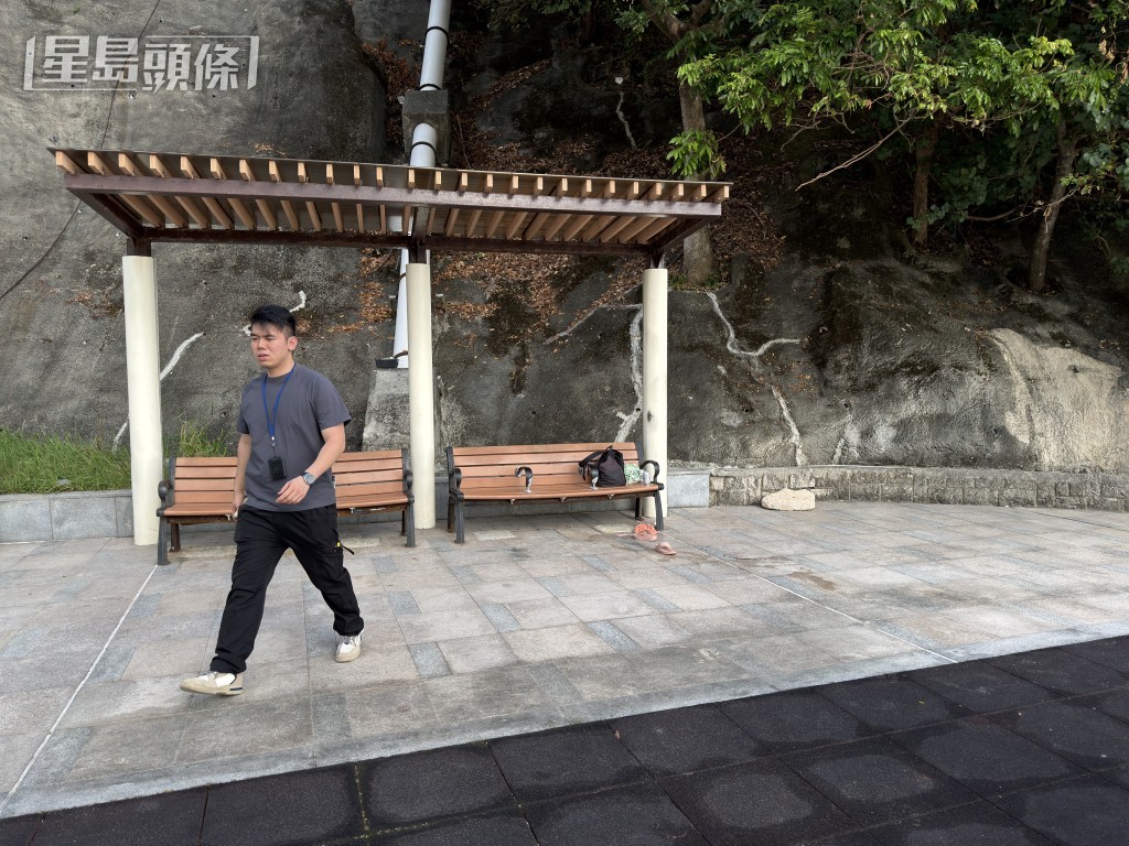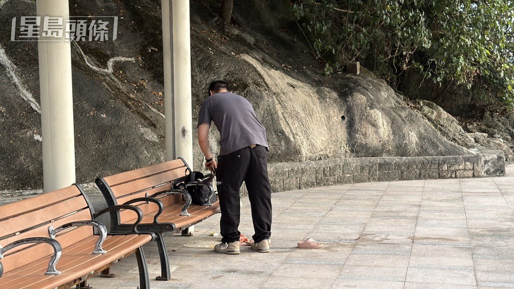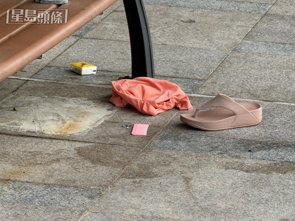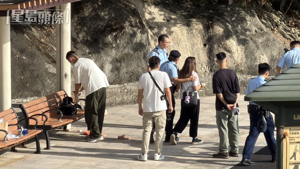 警員在長凳檢獲屬於女死者的一堆雜物。