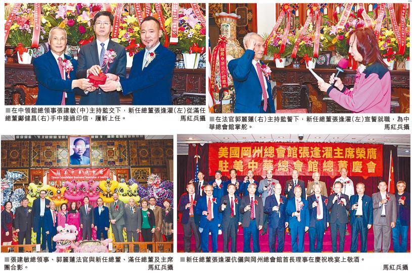 中華總會館總董交接典禮於10曰13日下午五時三十分在總會館禮堂隆重舉行,中領館總領事張建敏主持監交、法官郭麗蓮主持監誓。中領館領僑處主任王一鳴、領事姚瑤;州參議員威善高、州眾議員楊馳馬;市長羅偉代表Crystal Liang蒞臨祝賀並頒發賀狀;新任總董暨岡州總會館主席張逢濯、滿任總董暨寧陽總會館主席鄺健昌、肇慶總會館主席吉鴻雁、陽和總會館主席陳國慶、三邑總會館主席盧炳坤、通事李殿邦;北京同鄉會會長何孔華;美國岡州總會館、新會福慶堂、鶴山德厚堂、岡州保安總堂、崖西旅美同鄉會等首長暨理事;美國龍岡總公所、三藩市龍岡公所、三藩市名義寄盧等劉、關、張、趙四姓首長世誼及嘉賓出席觀禮。通事李殿邦主持交接典禮。
