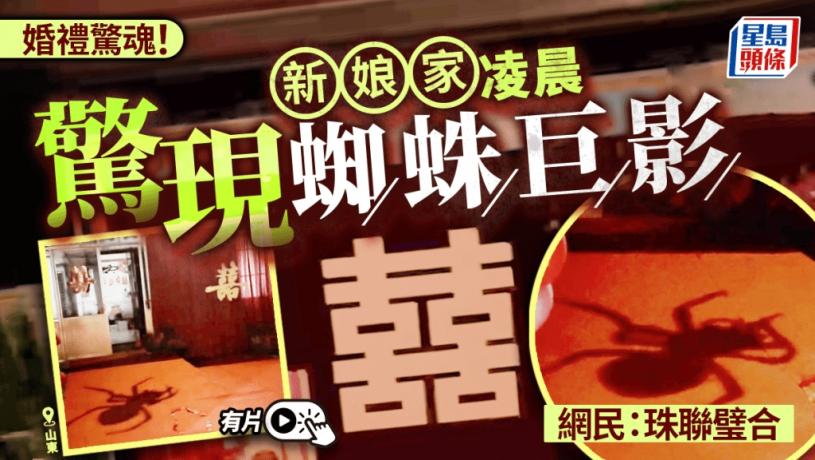 山東菏澤一場婚禮籌備現場,一隻蜘蛛在燈泡上爬行形成巨型倒影,非常駭人,拍攝者透露初見時被嚇得不輕。影片在網絡引發熱議,網友戲稱這是「珠聯璧合」好兆頭。