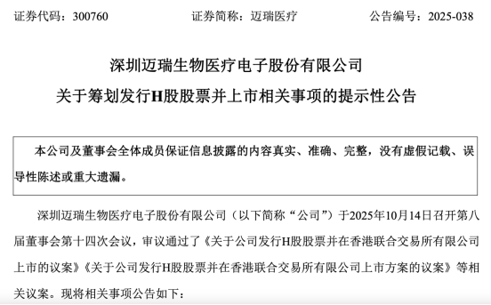 《星島》記者獲悉,邁瑞醫療在10月14日召開了第八屆董事會第十四次會議,審議通過了多份擬發行H股股票並在香港上市的相關議案、方案等,包括聘請安永為上市專項審計機構。但目前上市具體細節未最終確定,且相關發行並上市尚需提交邁瑞醫療股東會審議,並取得相關部門的批准審核。
