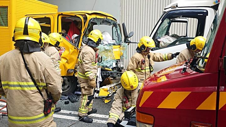 兩貨車車頭嚴重損毀。fb:車cam L(香港群組)